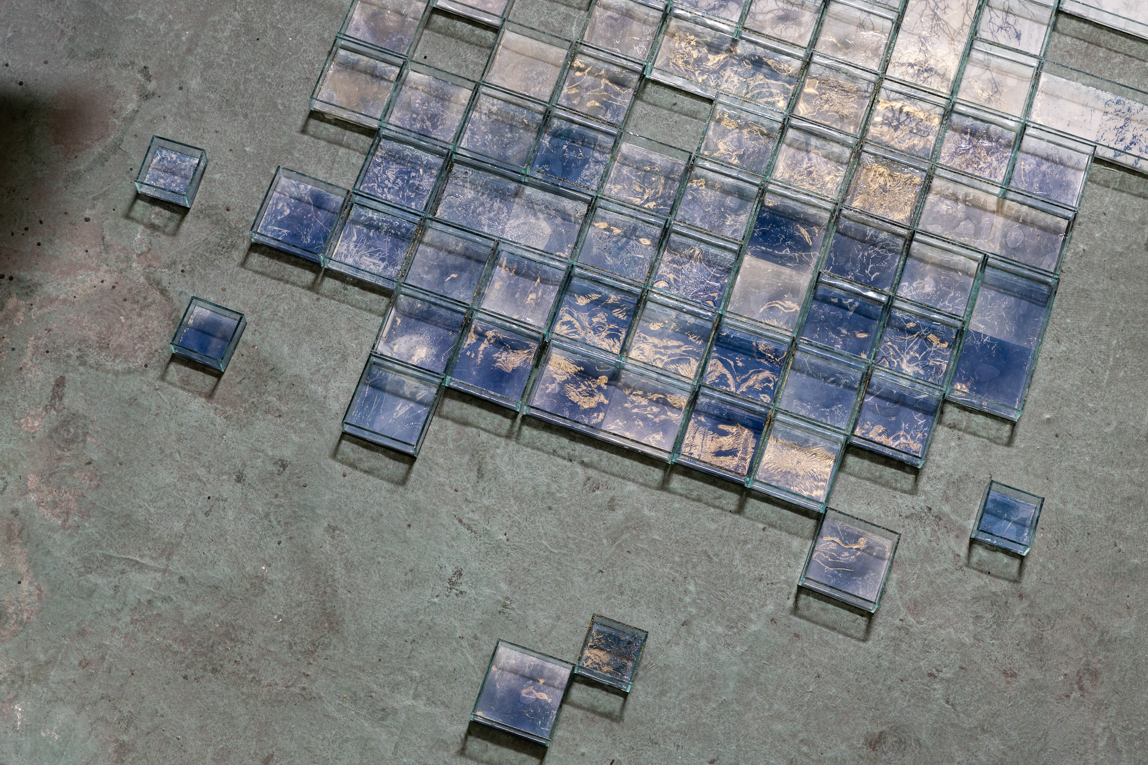 Eunice Sanchez’s “Di Kalaunan” reflects on humanity’s tenuous relationship with nature and the collective reckoning with environmental degradation. The installation features a single image of foliage, fragmented into cyanotype squares and layered with resin, embedded in glass panels. Once assembled, the squares form a complete image, evoking themes of fragility and impermanence. Displayed in an open space, the resin and glass capture and distort elements of the surroundings, with the sky becoming both a canvas and a symbol of nature’s enduring claim.
