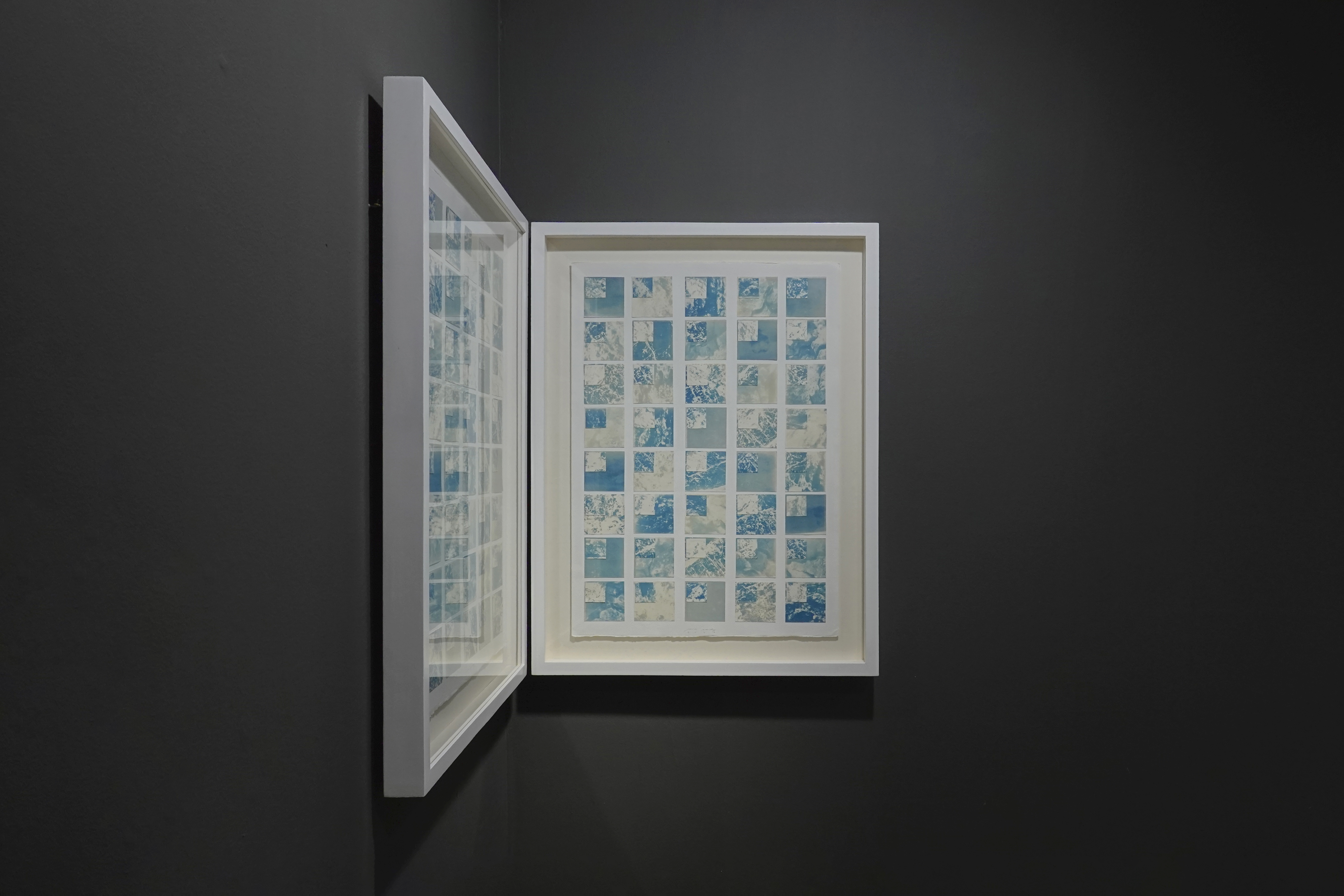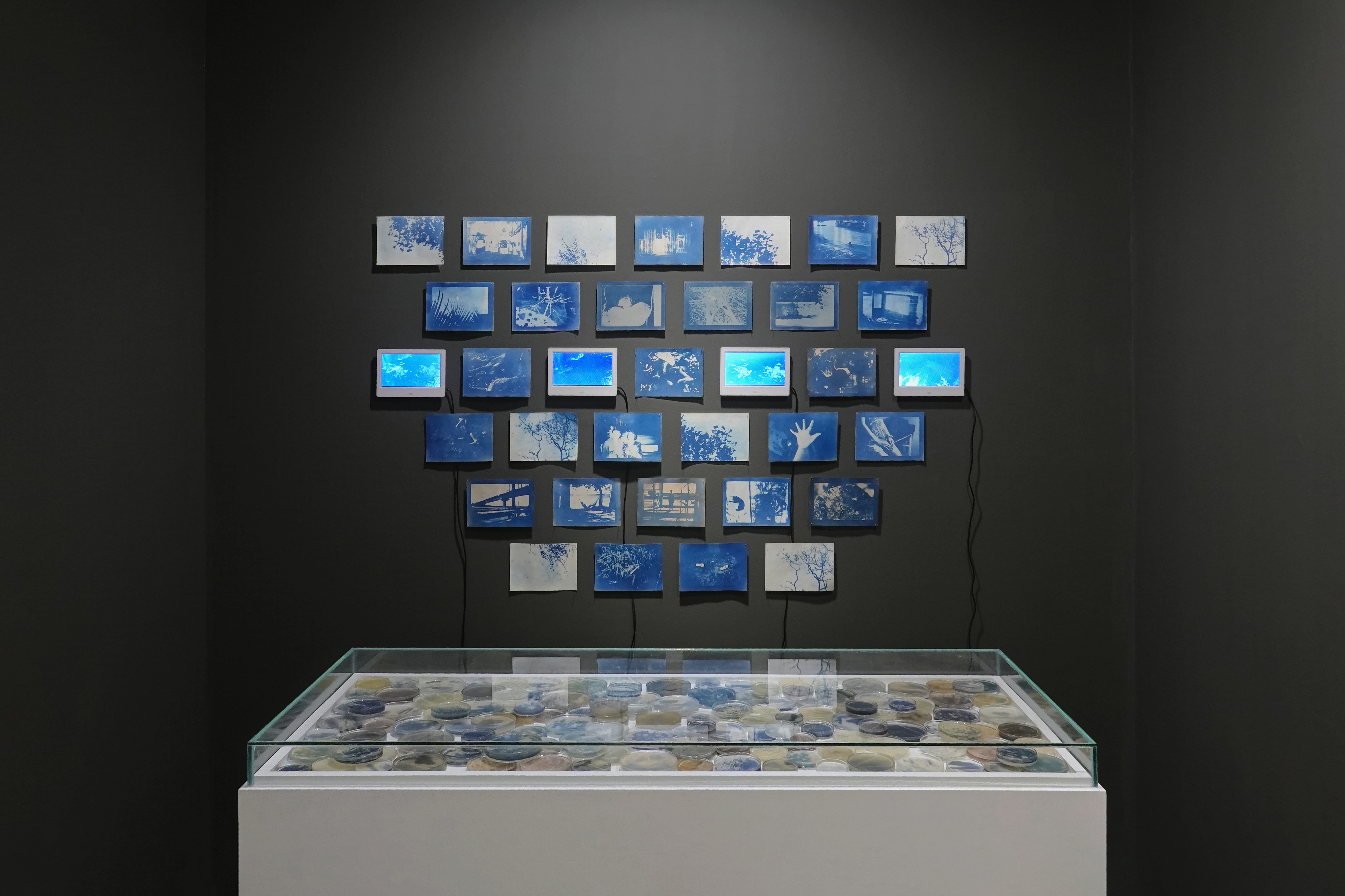 Sanchez responds with paper in petri dishes, pressing the skin of tree barks and portions of the water, mingling fragments of eyes and lips. The surfaces are laid out in a vessel akin to a coffin. The process of memory-keeping extends into framed permutations, cyanotypes unique to Sanchez’s practice that shows textures of soil, emulating the grand flux of nature that magnifies a sense of humility and smallness. Agpakada (To Ask Permission) crosses over with stop-motion images of an abrupt, vigil-like dream: a forest, flora, a girl giving permission to bid goodbye guiltlessly.